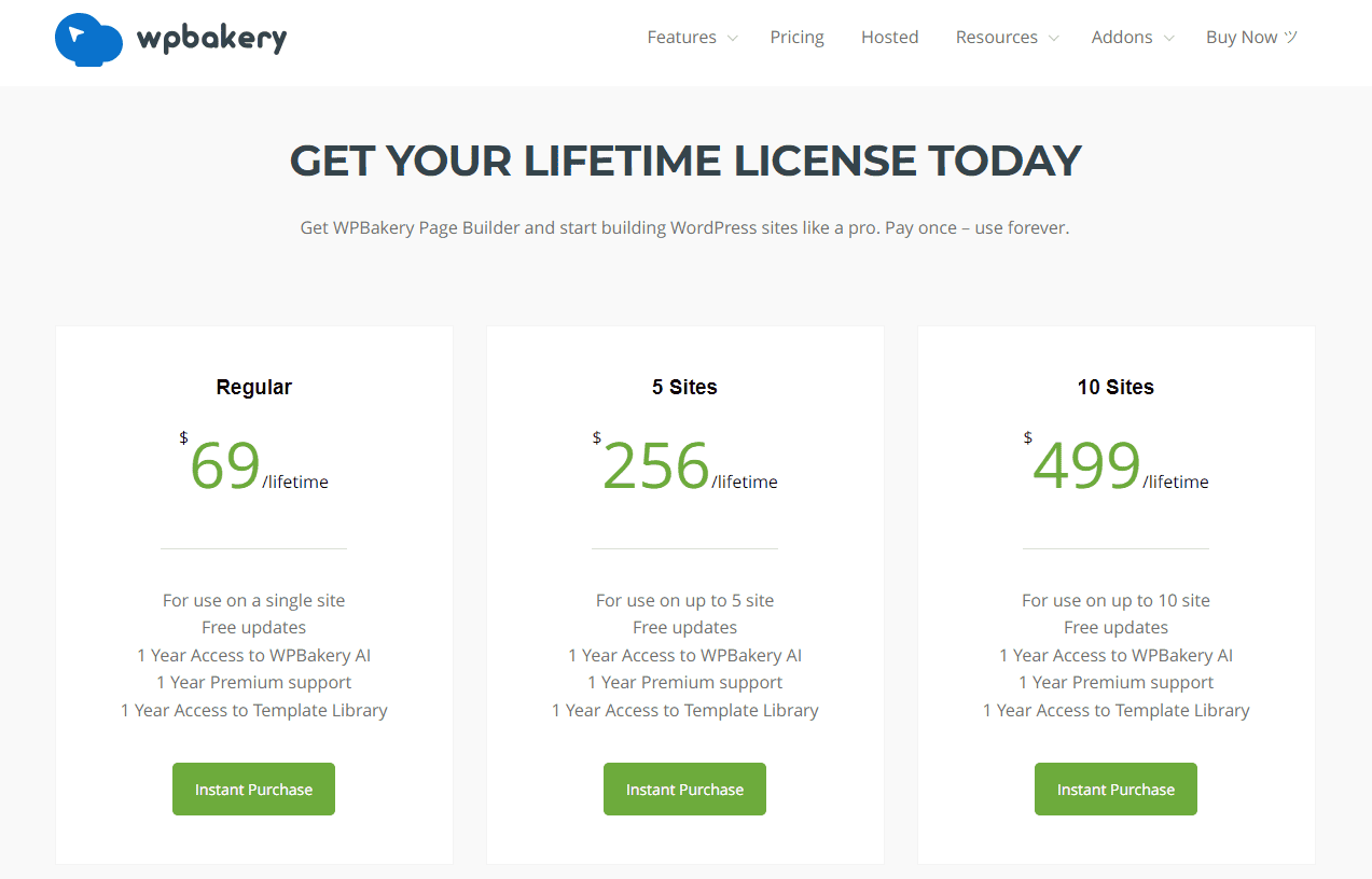 - Regular: $69 (For a single site, with free updates, 1 year access to WPBakery AI, 1 year Premium support, and 1 year Access to Template Library)